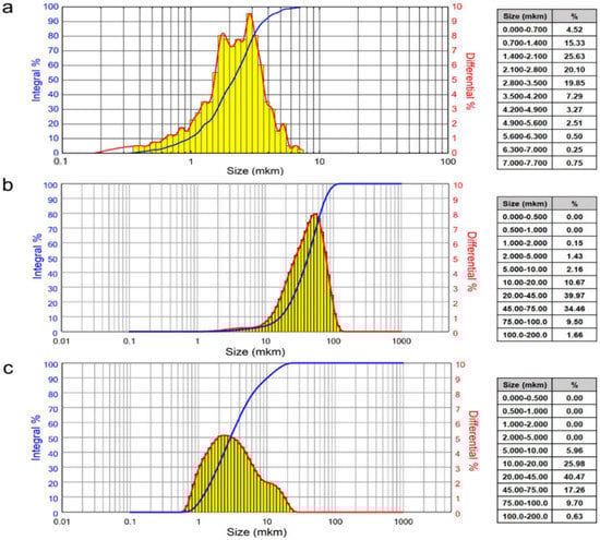 Particle size distribution histograms for antimicrobial additives: CuSO4 powder (a); CuO powder (b); CuO microspheres (c).