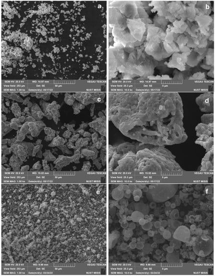 The morphology of the additives’ particles was studied using SEM. Figure 5 shows microphotographs of the general appearance of the antimicrobial additives’ particles. It was found that the sample of commercial copper (II) sulphate was characterized by particles with a lamellar structure, which may be due to the formation of crystalline hydrates during sorption of water vapor from the atmosphere (Figure 5a,b). The CuSO4 particles had a high specific surface area with a high variability in size and shape. The commercial CuO powder was characterized by coarsely dispersed irregularly shaped particles with numerous pores, and also had a large specific surface area (Figure 5c,d). On the contrary, CuO microspheres powder consisted of discrete particles, the shape of which was close to spherical (Figure 5e,f).