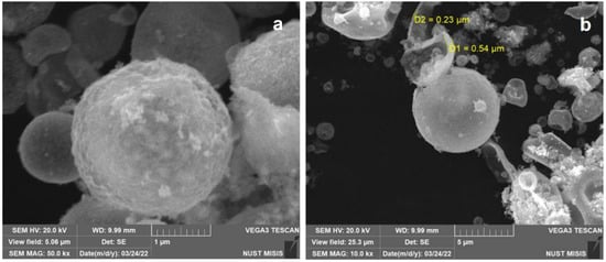 In order to characterize the volume parameters of CuO microsphere particles, the chipping structure of the particles was studied (Figure 6). The microspheres’ particles were hollow spheres with a wall thickness ranging from 0.23 to 0.54 μm. The inner volume of the microspheres was presumably filled with air and pyrolytic gas residues. The formation of a thin wall occurred during the process of mass transfer during pyrolysis. The particles with a size smaller than 100 nm were detected, which can explain the widening of maxima on the X-ray pattern of the sample. The presence of individual irregularly shaped particles in the sample can be explained by differences in size of aerosol droplets and fluctuations in the concentration of the initial solution.