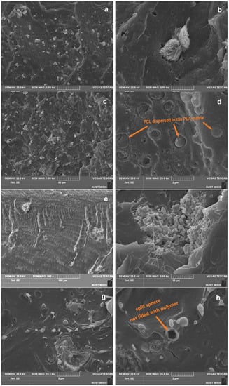 Morphology of cleavage of PLA-based composite: containing 10 wt.% CuSO4 powder (a,b); containing 10 wt.% CuSO4 and 5 wt.% PCL (c,d); containing 5 wt.% CuO powder (e,f); containing 5 wt.% CuO microspheres (g,h).