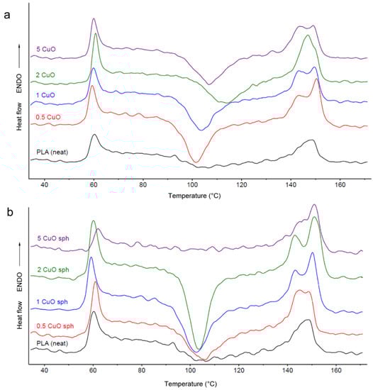 DCS curves of first heating of the neat PLA and PLA-based composites: containing 0.5–5 wt% CuO powder (a); 0.5–5 wt% CuO microspheres (b).