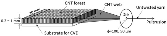 Carbon nanotubes (CNTs) are tubular nanofibers made of graphene and are thought to have higher elastic modulus and strength than carbon fibers. The ideal Young’s modulus and tensile strength are thought to be around 1 TPa and 100 GPa, respectively [1,2,3]. In order to utilize the excellent mechanical property of CNTs, various research works have been conducted. In recent years, research on dry spinning technology for multi-walled carbon nanotubes (MWNTs) has been reported [4,5,6,7,8,9,10,11,12,13,14,15]. The major approach is to draw out MWNTs from vertically grown MWNTs on a substrate, which is called a CNT forest or a CNT array. By pinching one end of a CNT forest and pulling it out horizontally, MWNTs can be drawn continuously because of the van der Waals forces among MWNTs. The drawn MWNT network structure is referred to as a CNT web, where MWNTs are almost aligned in the drawn direction. Thus, a unidirectionally aligned MWNT sheet can be made by winding a CNT web on a mandrel [7], or an MWNT spun yarn can be made by drawing and twisting a CNT web [4]. It was also reported that an untwisted MWNT yarn can be made by passing a CNT web drawn through a die without twisting [15]. These MWNT assemblies have the advantage that they can be used as fiber preforms for composite fabrication, because the MWNT assemblies can be densified while maintaining the unidirectional orientation of MWNTs. Research on developing high-performance polymer-based composites using MWNT assemblies has been conducted [16,17,18,19,20,21,22,23,24,25,26,27,28,29,30,31,32]. For example, Kim et al. [31] have reported composite materials with more than 200 GPa of Young’s modulus and 2 GPa of tensile strength by using untwisted yarns. However, the reported tensile properties of composite materials are much smaller than the values predicted by the rule of mixtures and the ideal tensile properties of CNTs.
