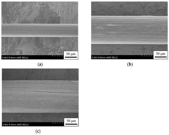 Untwisted yarns can be produced by passing a CNT web through a die as shown in Figure 1, where CNTs are almost aligned in the drawn direction [15]. The die diameter was 50 μm for the 10 nm CNT and 100 μm for the 25 nm CNT and 40 nm CNT. The drawing speed was 10 mm/s. The untwisted yarns were then densified by applying ethanol to untwisted yarns and drying [41]. The SEM images of densified untwisted yarns are shown in Figure 2 and the densities are listed in Table 2. In this study, the amount of a CNT web was controlled so that the density of the densified untwisted yarns was around 0.4 g/cm3.