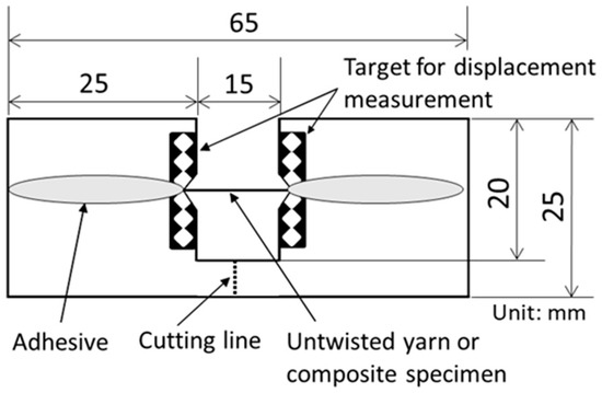 To evaluate the tensile properties of untwisted yarns and composite specimens, tensile tests were conducted by using the following method, which was similar to the tensile testing method in JIS R7606, “Carbon fibre—determination of the tensile properties of the single filament specimens”. An untwisted MWNT yarn or a composite specimen of 5 cm long was glued at both ends on a U-shaped paper mount with adhesive (cyanoacrylate type), as shown in Figure 4. The gauge length was set to 15 mm. After a specimen adhered to a paper mount was chucked, the paper mount was cut along the dashed line in the center before the tensile test. The tensile tests were conducted at a crosshead speed of 1 mm/min at room temperature in air. A non-contact extensometer was used to measure elongation. The number of tests was 5 or more in each fabrication condition. The cross-sectional area was evaluated from an FE-SEM image of a fracture surface.