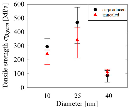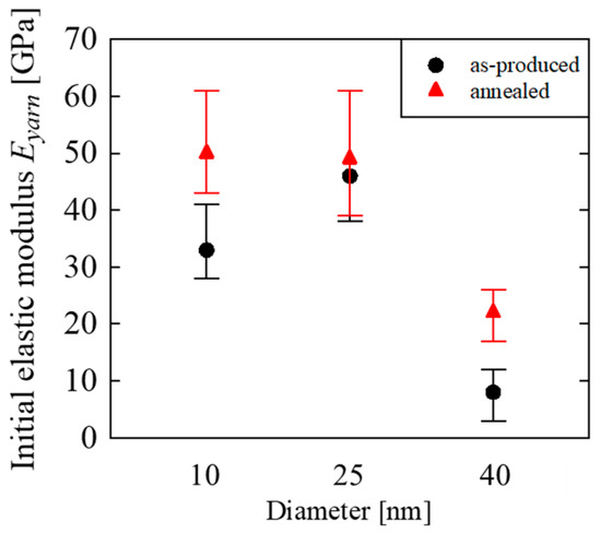 The authors of this paper conducted tensile tests in n of three MWNTs with about 30 nm diameters [40], which were produced by the same method for producing a 25 nm CNT and whose crystallinity was almost the same as that of the as-produced 25 nm CNT. The average Young’s modulus and tensile strength obtained by the tensile tests in an SEM were 197 GPa and 8.4 GPa, respectively. Young’s modulus and tensile strength of the as-produced 25 nm CNT estimated from the tensile properties of untwisted yarns in this study were 165 GPa and 2.6 GPa, respectively.