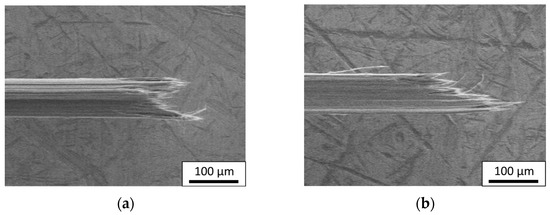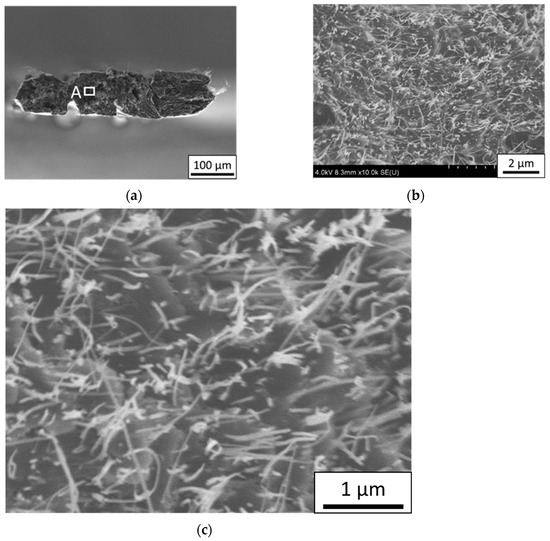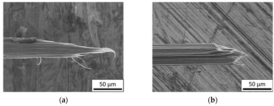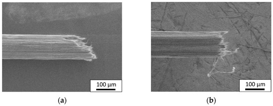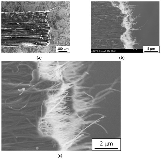 Side views and front views of a typical fracture surface are shown in Figure 17 and Figure 18. The specimen was produced by using untwisted yarns of as-produced 40 nm CNT. The fracture surface was perpendicular to the loading direction, and the pull-out length of the MWNT was about 5 μm or less, which was much smaller than the length of the MWNT, i.e., 1000 μm. Figure 18c also shows that the epoxy resin was well impregnated into MWNT yarns. The fracture surface and the state of resin impregnation into yarns were similar to the other composite specimens. It is noteworthy that the morphology of the fracture surface was quite similar to conventional unidirectional continuous fiber reinforced composites. The observation suggested that the fracture mode of the unidirectional MWNT reinforced epoxy composites was fiber breakage.