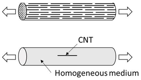 Young’s moduli of MWNTs were roughly estimated by using an analytical method proposed by the authors [41]. In the analysis, an untwisted yarn is modeled as a CNT surrounded by an equivalent homogeneous medium, as shown in Figure 11. The normal stress distribution in the axial direction of the CNT is evaluated by using a shear-lag model, and the secant modulus of the untwisted yarn is obtained as a function of the applied stress to the yarn. According to the analytical method, Young’s modulus of a CNT composed of an untwisted yarn E C N T can be roughly estimated from the initial elastic modulus of the untwisted yarn E y a r n .