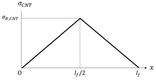 As a second situation, assume that load transfer between MWNTs is performed by slippage between MWNTs. This implies that shear stress acting on the surface of an MWNT due to van der Waals forces from adjacent MWNTs is uniform. If the length of the MWNT is enough long, the untwisted yarn can fail due to breakage of MWNTs. Among such situations, the lowest tensile strength is given when the normal stress in the center only reaches the tensile strength of an MWNT, as shown in Figure 12. In this case, the force equilibrium gives the following equation between the tensile strength of the untwisted yarn and the tensile strength of the MWNT.