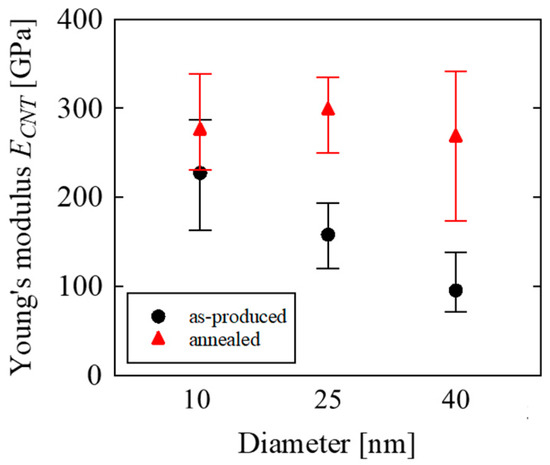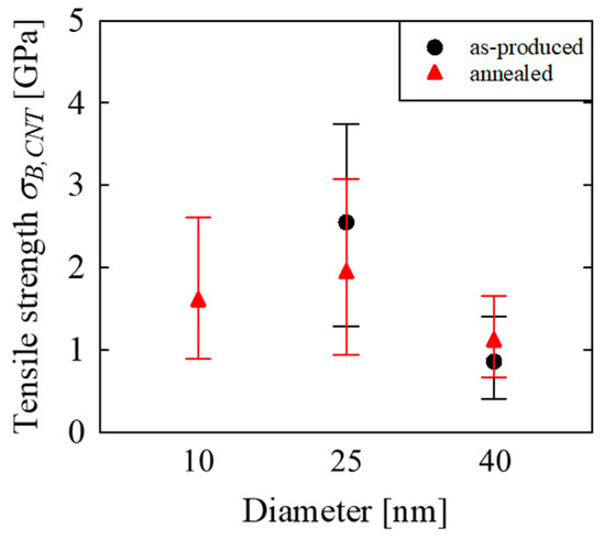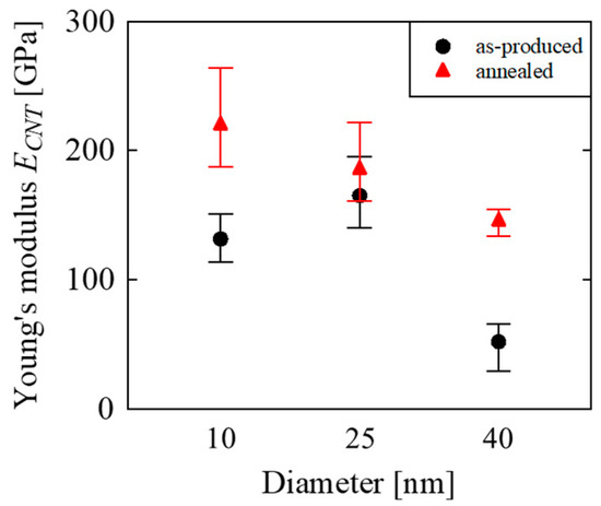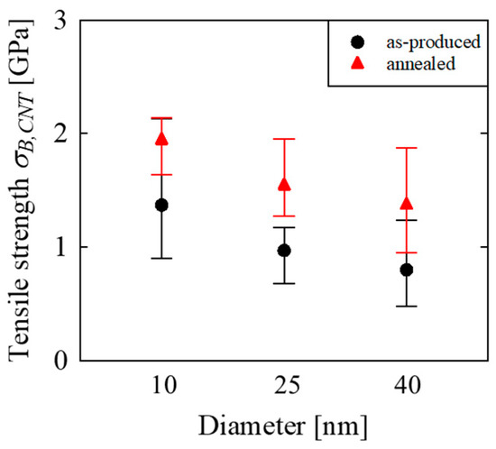 The figures show that annealing improved Young’s modulus, especially of the 10 nm CNT and 40 nm CNT. Yamamoto et al. [37] suggested that annealing at an elevated temperature reduces the defects in MWNTs and improves Young’s modulus. In contrast, annealing did not improve the tensile strengths in our case. The reason will be discussed later.