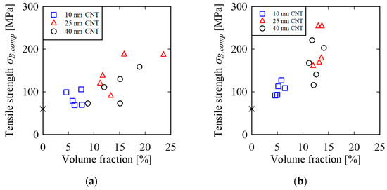 Young’s moduli and tensile strengths of composite specimens are shown in Figure 15 and Figure 16. Young’s moduli were calculated from the slope between ε = 0.05 %   and   0.25 %   . Since the volume fractions of the CNT had large scatter, the results are plotted as a function of the volume fraction of the CNT. Young’s modulus and the tensile strength of epoxy, E = 3.5 GPa and σ B = 60 MPa, where both are typical values of general-purpose epoxy, are plotted because the tensile tests of epoxy adhesive film were not feasible.