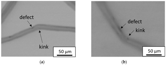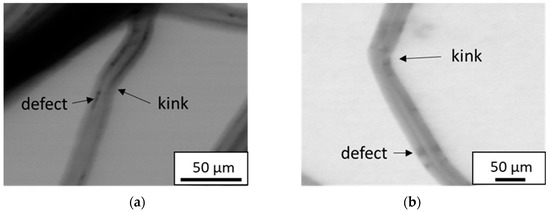 Typical stress–strain curves of untwisted yarns are shown in Figure 5. The initial elastic modulus and tensile strength are plotted in Figure 6 and Figure 7, respectively. The initial elastic moduli were calculated from the slope between ε = 0.05 %     and   0.25 %   . In the figures, the error bars represent the maximum and minimum values. Figure 8, Figure 9 and Figure 10 show side views of typical breaking points of untwisted yarns. As stated previously, the lengths of MWNTs were 200 μm for the 10 nm CNT, 500 μm for the 25 nm CNT and 1000 μm for the 40 nm CNT. Except for the untwisted yarn of the as-produced 10 nm CNT, the length involved in the fracture surface of an untwisted yarn was much shorter than half the CNT length, implying that the tensile strength of untwisted yarns was mainly governed by breakage of MWNTs, not slippage between MWNTs, as discussed later. In contrast, the length involved in the fracture surface of the untwisted yarn of as-produced 10 nm MWNT was about half of the MWNT length (i.e., 100 μm), and thus the final failure of the untwisted yarn would be dominated by slippage between MWNTs.