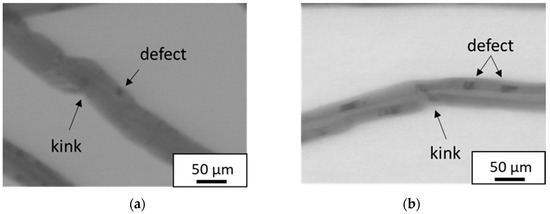 For the direct evaluation of the tensile strengths of CNTs, tensile tests of CNTs in a transmission electron microscope (TEM) or a scanning electron microscope (SEM) have been conducted [33,34,35,36,37,38,39,40]. The reported tensile strengths of CNTs were, however, fairly lower than the ideal tensile strength of CNT. Our experiments for spinnable MWNTs [38,40] showed that the tensile strength was around 10 GPa. The discrepancy probably arises from defects of MWNTs [38]. The result means that the tensile property of spinnable MWNTs should be improved for increasing the tensile property of composite materials fabricated by using MWNT assemblies as the preform.