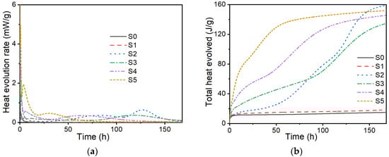 Figure 1a,b show the calorimetric results of mixtures S0–S5. The results show that borate solution exerts a strong retardation effect on cement hydration, in agreement with the existing research. With the addition of only 0% to 1% alkali content of Na2SiO3, the total heat of S0 and S1 still did not overcome the inhibitory effect of the borate solution mainly because of the low alkalinity in S0 and S1 paste []. When a sufficient amount of Na2SiO3·9H2O was added, the hydration process that stopped because of the borate solution was restarted. With incremental addition of Na2SiO3, the heat flow peaks appeared early, but the total heat evolved increased and then decreased. S2 sample had the highest total heat of 160 kJ/g among these samples. However, S2 sample still reached the final setting time within the first two days. Based on these results, samples S3, S4, and S5 were selected for the compressive strength test.