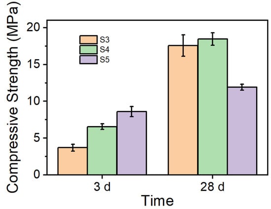 The compressive strength and durability of S3, S4, and S5 samples are shown in Figure 2 and Table 4, respectively, and the setting time of the S2 sample was too long to conduct the compressive strength test. Mixes of S0 and S1 did not set after 28 days of curing. As a result, only mixes of S3, S4, and S5 were tested on their compressive strength and performed other characterizations. The results indicates that the compressive strength of samples increased with curing ages and that the 28-day strength of all the samples was higher than 7 MPa, which is the limit given in the Chinese standard. In addition, the strength loss of grouts after the freeze–thaw test was less than 25%, which meets the requirements of the Chinese standards. These results show that the hydration process of samples with sufficient addition of NaOH and Na2SiO3 can overcome the inhibitory effect of the borate solution, allowing the hydration process to restart, and the samples also meet the requirements of the Chinese standards.