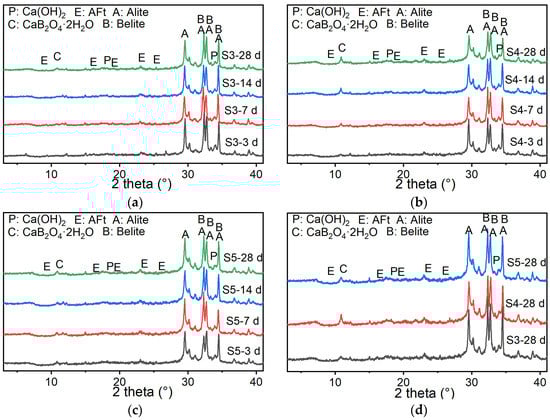 The crystalline mineral phase assemblages of samples S3–S5 at different ages is shown in Figure 3. The results indicate the hydration products were all composed of portlandite [,], ettringite [], and calcium metaborate (CaB2O4·2H2O). With the increase in Na2SiO3 content, the intensity of calcium metaborate at 28 days increased and then decreased, showing the same trend as the compressive strength results at 28 days. In these samples, the intensity of calcium metaborate increased and that of alite decreased with curing age. With the addition of a sufficient amount of sodium hydroxide and sodium metasilicate, the ulexite retardation layer that covered the surface of the cement clinker dissolved and decomposed [] and the hydration process restarted, showing the same tendency as the calorimetry results. Nevertheless, the residues of anhydrate cement still existed, and therefore, the compressive strength of the paste was lower than that of cement blended with same amount of water.