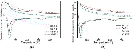 The thermal analysis of samples S3–S5 at different ages is shown in Figure 4. All the TG curves of the samples that can be activated have three regions, namely the 30 °C–300 °C region, 400 °C–500 °C region, and 600 °C–800 °C region. In the first region, the dehydration process of several hydration products occurred. C-(A)-S-H gel [], ettringite [,], and other hydrates lost the interlayer water as CaB2O4·2H2O was dehydrated at 131 °C []. The dehydroxylation of portlandite [] occurred in the 400 °C–500 °C range. The 600 °C–800 °C region corresponds to the decarbonation of calcium carbonate []. Quantitative thermal analysis of the weight loss in samples S3–S5 at different ages are listed in Table 5. The results indicate that the weight loss of portlandite and calcite increased at 28 days with the addition of sodium metasilicate; the results indicate that the hydration process of S4 is the highest among these three samples. Further, with the addition of Na2SiO3, the amount of chemically bound water and calcite increased.