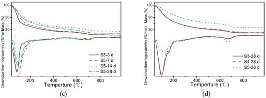 Thermal analysis at different ages for (a) S3, (b) S4, and (c) S5, and (d) thermal analysis of different samples at 28 days.