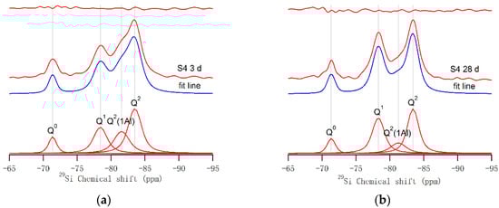 Figure 5 shows the 29Si MAS NMR spectra of S4 after 3 and 28 days. Four main different environments of silica in the paste were detected through 29Si MAS NMR. The chemical shift of anhydrate cement (Q0) was 71.3 ppm, while Q1 was −79 ppm [], Q2(1Al) was −81.5 ppm [], and Q2 was −83.5 ppm []. Table 6 lists the relative fractions, Al/Si ratio, and MCL as obtained by deconvolution of 29Si MAS NMR spectra.