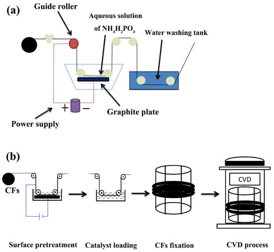 Carbon fiber (CF) has excellent properties, including high tensile strength, high tensile modulus, good compressive strength, low density, and excellent electrical and thermal/chemical resistance []. CF reinforced polymer composites have been widely used in aerospace, military industry, transportation, leisure and sports, and other fields [,,]. These composite materials are made of resin and CFs by laminating and pressing under high temperature and pressure. Resin, as a continuous phase, and CFs, as a discontinuous phase, both contribute to the overall performance of the composite materials []. However, the contribution of the resin matrix to the overall performance of the composite materials is limited and cannot be easily improved. Therefore, the improvement of the strength of composite materials mainly depends on the performance of the interface between the resin and fibers, and enhancements of interface performance are usually achieved by the surface modification of CFs [,,]. Common CF surface modification treatment methods include the chemical grafting method [,], chemical vapor deposition (CVD) method [,,], etc. Among them, the method of in situ growth of CNTs on the surface of CFs by CVD has received a great deal of attention. This method has the advantages of adjustable process parameters, controllable growth of CNTs, economical-growth equipment, etc. [,,,]. Moreover, as a nanomaterial, CNTs have a special one-dimensional tubular structure, and their mechanical properties, electrical and thermal conductivity, are marvelous [,]. Therefore, growing CNTs on the CF surface to prepare CNTs/CF multi-scale reinforcements can introduce the excellent properties of CNTs into CF reinforced composites, resulting in a good reinforcement effect [,,,]. Ideal CNTs/CF multi-scale reinforcements need to uniformly grow a layer of CNTs on the surface of CFs. The question of whether catalyst particles, as the “seeds” for growing CNTs, can achieve firm attachment and uniform distribution is crucial in obtaining high-performance samples []. Nevertheless, as an industrialized product, CF has undergone pre-oxidation and medium-high temperature carbonization treatment. The surface is composed of an ordered, six-membered ring graphite sheet structure with almost no active functional groups. The surface is smooth and chemically stable [,], which prevents the attachment of a catalyst precursor and gives rise to the phenomenon of uneven distribution or agglomeration and deactivation of catalyst particles. Hence, the surface of CFs must be modified to make it easier to attach a catalyst precursor in order to ensure the uniform growth of CNTs. Common surface treatment methods for CFs include electrochemical anodic oxidation (EAO) [,,], plasma treatment [,], liquid oxidation [], etc. Among these, EAO and the liquid oxidation methods have simple operation processes and low economic cost and are worthy of in-depth research and development [,,,]. In particular, since CF has good chemical stability in various aqueous electrolytes and excellent electric conductivity, EAO can be used as an ideal surface modification approach to treat continuous fibers []. Additionally, many parameters can be adjusted during EAO, such as current, potential, and electrolyte composition [,]. Moreover, the treatment process of EAO is relatively mild and will not cause significant damage to the fiber surface []. Generally speaking, EAO includes two processes: anodic oxidation and cathodic reduction. The input electric energy is converted into chemical energy, and water is decomposed into strong oxidants at the anode to etch the surface of CFs, causing changes in surface functional groups and roughness [,].