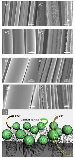 Figure 2 shows SEM images of the samples with different surface modification treatments, the surfaces after growing CNTs, and a structure diagram of CNTs/CF multi-scale reinforcements. It can be seen from Figure 2a,b that the surfaces of the desized CFs were very smooth and that CNTs had grown on the surface after the CVD process. However, the distribution was extremely uneven. Many CFs were not covered with CNTs to expose the smooth surface, and a large number of impurities and clustered CNTs appeared in the gaps between adjacent CFs. This was because the unmodified CF surface could not attract the catalyst precursor particles in solution effectively, meaning that it was left in the gaps. In this case, the catalyst precursor remaining after the volatilization of anhydrous ethanol was prone to agglomeration to form coarse catalyst particles during reduction. Additionally, local aggregations of CNTs formed during the catalysis process, and the catalyst particles that were too large lost their activity. In contrast, in Figure 2c–h, it can be seen that the surface of samples underwent slight changes after the modification treatment. This was due to the surface of CFs being oxidized and etched to make an unstable and disordered turbostratic graphite structure which fell off, leaving an indentation []. In comparison, the grooves on the surface of CFs treated with HNO3 solution were too thin and shallow. Additionally, the inconspicuous grooves made a limited contribution to the adhesion of the catalyst particles, the distribution was not uniform, and there were point defects on the surface. The surface of EAO-treated samples had a relatively obvious groove structure, which was evenly distributed, and the groove morphology was better than those of the other two methods. The obvious groove morphology showed that its width and depth were large. Such a structure can effectively provide a “landing field” for precursor particles. The effect of H2O2 treatment was somewhere in between. The morphology images of the grown CNTs also effectively reflect the role of the grooves. Compared with the desized CFs, the growth quantity of CNTs in the H2O2-treated sample was not significantly increased, and the distribution uniformity was slightly improved. The number of CNTs in the HNO3-treated sample was significantly increased, but the CNTs only grew on half of the sides of CF, presumably because the CFs were not under tension during the immersion modification treatment, and some CF surfaces were not fully etched by lamination. The effect of CNTs/CF obtained by EAO treatment was most satisfactory; the CNTs were evenly distributed and the density was appropriate.