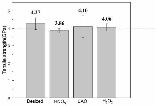 Single-filament tensile strength of CFs obtained using different surface pretreatment methods. (The dotted line in the figure indicates we set 4 GPa as the reference.)