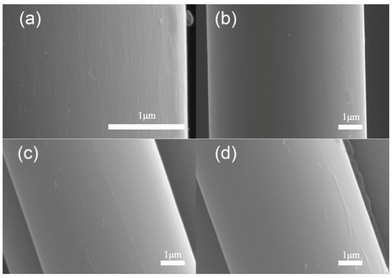 EAO treatment also has two sides. On the one hand, it provides the conditions for CFs to attach catalyst precursor particles, while on the other, it causes damage and reduces the mechanical strength of CFs. In order to achieve a more balanced effect, samples with four parameters, i.e., 50 C/g, 100 C/g, 150 C/g and 200 C/g, were created for a comparative analysis. Figure 4 shows SEM images of the sample surface treated with different electrochemical intensities. It can be seen that when the intensity was 50 C/g, heavy magnification was necessary to observe the fine grooves. With the increase of intensity, the number of grooves on the CF surface gradually increased, as did the depth and width of the groove structure and the adsorption capacity for catalyst precursor; however, the excessive etching intensity penetrated deep into the body structure of CFs to cause a loss of mechanical properties.