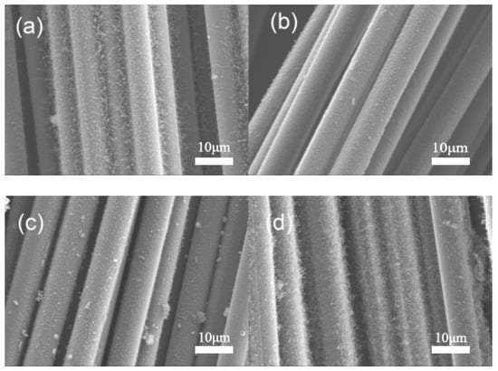 Surface morphology of CFs with CNTs treated with different EAO intensities. (a) 50 C/g, (b) 100 C/g, (c) 150 C/g, (d) 200 C/g.