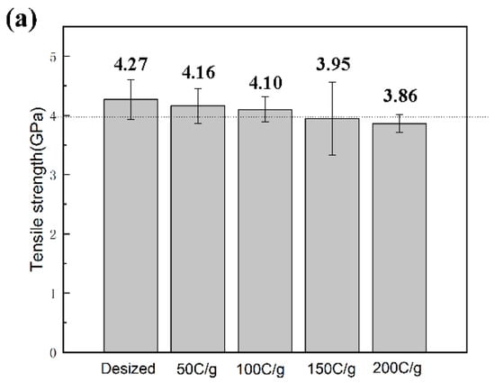 Figure 6a shows the tensile strength of each sample after treatment with different electrical intensities. Compared with the value of 4.27 GPa for the desized sample, the tensile strength under the condition of 50 C/g was 4.16 GPa, i.e., a decrease of 2.57%. Additionally, corrosion occurred at this time. However, the oxidative damage to the CFs was not large. The tensile strength was 4.10 GPa at 100 C/g, a decrease of 3.98%. As the treatment intensity increased, the mechanical properties of the CFs continued to decline; the tensile strength at 150 C/g was 3.95 GPa. Under the condition of 200 C/g, the tensile strength was 3.86 GPa, marking a decrease of nearly 10%. At this time, the CFs were seriously damaged. During the electrochemical treatment process, the oxidation etching penetrated into the interior of the CFs, and the etching caused by the aggregation of catalyst particles exacerbated the strength loss.