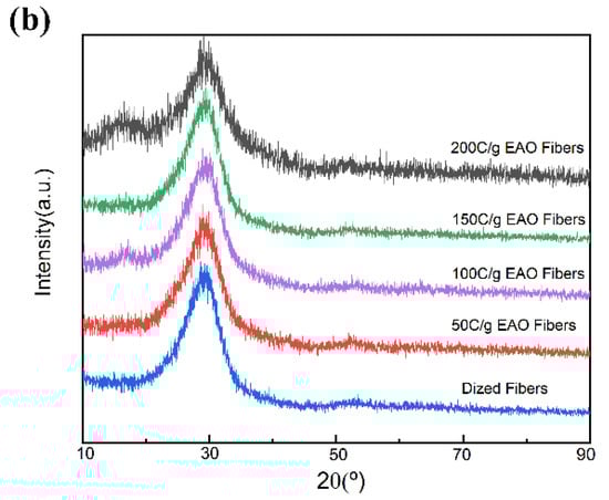 It can be seen from the XPS test that the EAO treatment added functional groups containing O and N elements to the surface of CFs. These active functional groups contributed to the loading of catalyst precursor particles. These changes are reflected in the structure of the surface graphite crystallites. Figure 6b demonstrates the XRD patterns of the desized CFs and CFs with different electrochemical treatment intensities. It can be seen that each sample had a wide diffraction peak around 2θ = 25.6°, which is the characteristic diffraction peak of the (002) crystal plane of the CF surface through data comparison; the more complete the graphite turbostratic structure, the sharper the peak shape. Compared with the desized CFs, the peak shapes of the treated samples were broadened, indicating that the graphite structure was damaged to different degrees.