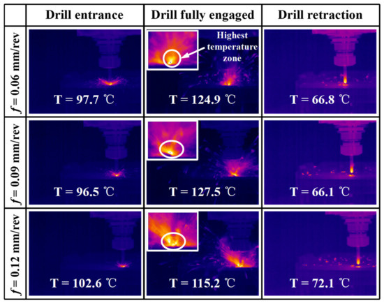 Machining temperature is a characteristic phenomenon of heat accumulation resulting from the tool–work interaction following the material separation process. When dealing with the hole-making processes of CFRP composites, drilling temperature is a critical issue that has to be carefully addressed, as high levels of temperatures can be easily accessed due to the poor heat dissipation of the drill–composite interaction. Additionally, high temperatures are extremely detrimental to the surface integrity and mechanical properties of cut composite holes as they can cause degradation of the composite properties, debonding of the fiber/matrix interface, or even the glass transition failure of the matrix base. Therefore, it is essential to characterize the variation laws of the temperature rise and progression during the machining of CFRP laminates. Figure 3 and Figure 4 show the recorded thermal images of the drilling temperature development under varying feed rates for the candlestick and step drills, respectively, during CFRP machining. It is clear that the temperature progression characteristics can be divided into three stages with respect to the tool–work interaction. At the early stage, the drill edges start to attack the composite laminate, and a large amount of cutting heat is progressively generated through the tool–chip and tool–work interactions. As brittle fracture dominates the chip separation of the carbon/epoxy composites, more cutting heat is likely to accumulate within a very narrow tool–chip interface, resulting in a high temperature rise as the drill tends to penetrate inside the composite. At the drill entrance stage, moderate levels of drilling temperatures are produced for both the candlestick and step drills. Meanwhile, with the ongoing tool advancement, the drill edges are fully engaged in the cutting of the fiber/epoxy material. In such circumstances, peak values of drilling temperatures are identified through the thermal image examinations for both drills used. Due to the heat accumulation effects and the full drill interaction with the composite material, the maximum temperature is reached, which indicates the highest risk of occurrence of the thermally-induced damage onto the internal composite hole walls. In most cases, the candlestick drills are found to produce relatively lower values of drilling temperatures than the step drills, particularly under the full drill–work interaction stage, as depicted in Figure 3 and Figure 4. Additionally, increasing the feed rate tends to elevate the maximum temperatures at the full tool engagement stage, due to the increased amount of frictional heat generated as the feed rate rises. Eventually, when the tool retracts from the composite workpiece, the drilling temperature appears to decrease dramatically because of the effective heat dissipation and air cooling of the tool–work system. It is also worth noting that both the candlestick and step drills yield comparable values of drilling temperatures at the drill retraction stage while machining the CFRP laminates.