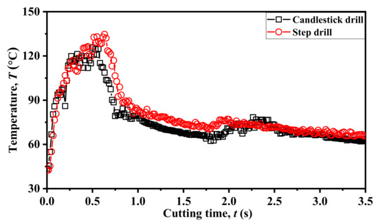 Comparison of drilling temperature development between candlestick and step drills (Vc = 120 m/min and f = 0.06 mm/rev).