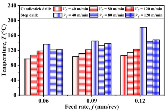 Figure 5 also shows the comparative evolution of the drilling temperatures in terms of the cutting time (t) following a complete CFRP drilling process for both types of special tools. It is clear that the drilling temperature signals fluctuate significantly during the composite removal process, which exhibits a rapidly increasing trend at the drill entrance stage when the tool starts to attack the composite specimen. Then, the temperature signals for both drills appear to decrease gradually with the tool advancement as the drill edges start to exit the last composite plies, resulting in reduced frictional heat generation following the chip removal process. The previous investigation done by Fu et al. [35] revealed the complex drill-exit temperature characteristics for UD and MD CFRPs, and similar temperature changes were identified in their work. The maximum drilling temperatures for both drills seemed to be reached at around t = 0.5 s under the tested process parameters. The corresponding feed depth of the time is about 2.8 mm after the calculation using the time, feed rate, and cutting speed. Moreover, the candlestick drill is found to promote lower levels of peak drilling temperatures than the step drill. Figure 6 presents the comparison of the maximum temperatures recorded in the CFRP drilling between the two types of drills. Note that the maximum temperatures denoted herein signify the average value of the highest temperature range during the composite drilling. The results also indicate that the candlestick drills generally yield lower drilling temperatures than the step drills for all of the cutting conditions examined. This is due to the two protruding tips of the candlestick drill along the drill periphery that reduce the frictional heat generation and improve the heat dissipation at the tool–chip interactions. Additionally, the cutting speed definitely shows a positive impact on the progression of drilling temperatures for both tools, except for the abnormal temperature data at Vc = 40 m/min for the step drill. The phenomenon is associated with the intensified friction of the tool–composite interaction when the cutting speed increases. Moreover, increasing the feed rate appears to raise the drilling temperatures for the two special drills when machining the CFRP materials.