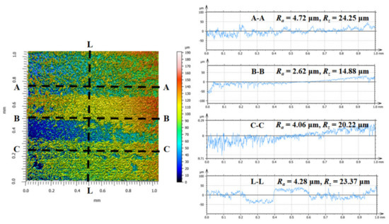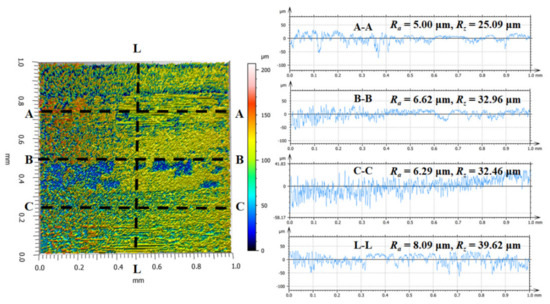 Machining of fibrous composites differs significantly from the cutting of isotropic metals and steels due to the varying chip separation mechanisms associated with the fiber orientation. The material removal complicates the surface generation of hole walls for the composites under drilling operations. Hole wall morphologies can be considered as one of the most important criteria in assessing the quality attributes of drilled CFRP composites. In general, it is rather difficult to generate smooth surface morphologies, as the material removal mode changes dynamically with the drill rotation during the hole-making process. Figure 7, Figure 8, Figure 9 and Figure 10 show the topographies of the CFRP hole walls produced by the two types of drills under the fixed cutting conditions (Vc = 120 m/min and f = 0.09 mm/rev). Figure 7, Figure 8, Figure 9 and Figure 10 all feature the same fiber orientations. From Figure 7, surface flaws due to interlaminar cracking are noted, which feature deep blue colored zones. The finely-cut composite surfaces mainly exist in areas involving the shear-induced fractures of fiber plies. Additionally, the profiles of four circular arc curves at the A–A, B–B, C–C, and L–L cross-sections are plotted in Figure 7 and Figure 9. It is noted that the surface profiles fluctuate significantly along both the radial and axial directions of the holes, which is due to the inherent variations in the surface of the fibers and the matrix. Additionally, the average surface roughness values (Ra) of the selected cross-sections mainly range from 5.00 to 6.29 μm along the hole radial direction, while Ra reaches its maximum value toward the hole axial direction at the L–L cross-section. This is due to the significant disparity in fiber orientation between adjacent fiber plies toward the composite thickness direction.
