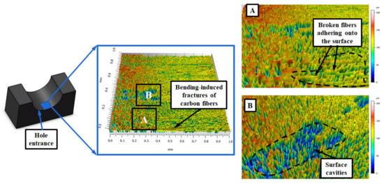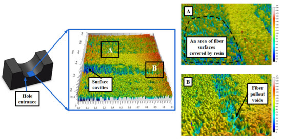 With respect to Figure 8, it shows the three-dimensional topographies of cut hole walls at the entrance side. It is evidenced that the cut CFRP hole morphologies feature smooth fiber surfaces containing a certain degree of surface cavities. In contrast, the hole wall morphologies produced by the step drill appear to be much better than those cut by the candlestick drill. As depicted in Figure 9, the Ra values of the four selected cross-sections are relatively lower than those gained by the candlestick drill. The phenomenon is due to the reaming effects of the secondary step edges, indicating the superiority of the step tools in achieving a better hole surface finish than the candlestick tools while machining the CFRP laminates. Moreover, the surface defects residing within the composite hole cut by the step drill mainly include surface cavities due to the loss of matrix, resin smearing, and fiber pullout voids, as shown in Figure 10. Note that the previous research carried out by Kubher et al. [36] addressed the evolution of in-situ cutting temperature and machining forces during the conventional drilling of MD CFRP laminates. Similar surface defects, including resin smearing and bending-induced fracture of carbon fibers, could be found in the research. For both drills in the current investigation, no significant evidence of interlaminar delamination at the hole entrance side is identified through the CLSM examination.