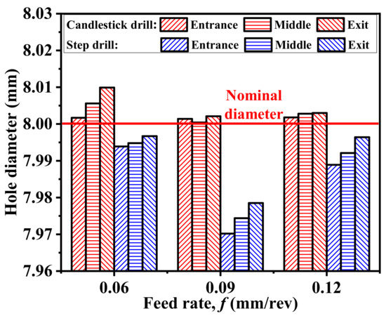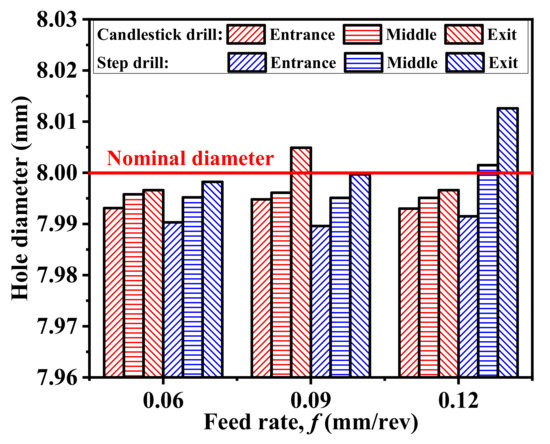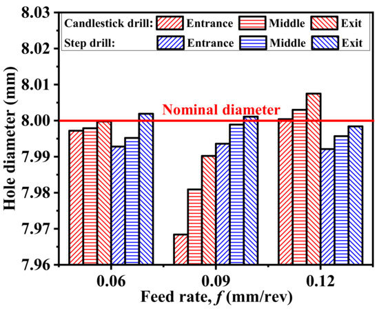 The hole diameter in terms of different feed rates and drill bits (Vc = 40 m/min).