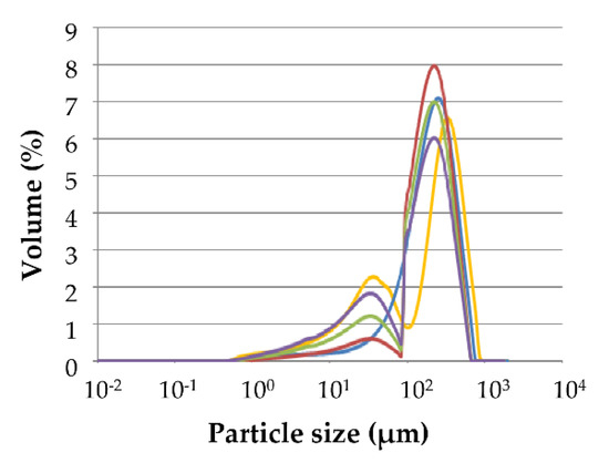 As reported in Figure 2, the coarse RGA showed a monomodal (200 µm peak) particle size distribution compared to the bimodal one of quartz sand (300 and 35 µm peaks). Since fine RGA owned a monomodal particle size distribution with a peak at 20 µm, the combination of fine and coarse RGA allowed reproducing a particle size distribution similar to quartz sand; this was more emphasized for increased fine RGA content (Figure 2). For all the involved PCs, the coarse fraction contributed mainly to composite structure and fine fraction to compaction and porosity reduction.