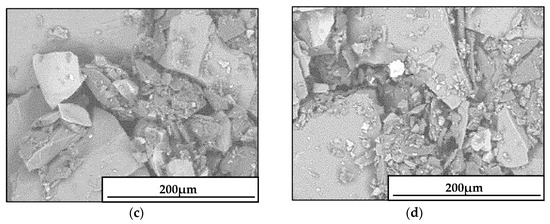 RGA compaction at increasing content of fine fraction: (a) 0 wt%, (b) 10 wt%, (c) 20 wt%, (d) 30 wt%. SEM micrographs at 400× magnification.