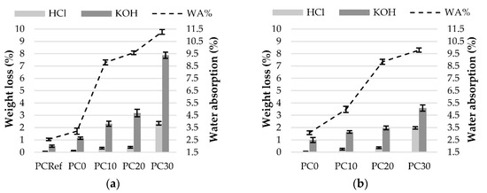 Due to the low resistance to alkali of unsaturated polyester resin, the chemical resistance test showed that all PCs owned a better resistance to HCl etching, so lower weight loss, than to KOH (Figure 4). Moreover, it was observed that higher content of fine RGA increased the weight loss, especially for alkali etching. In contrast, PCRef and PC0 displayed similar and the best chemical resistance and water absorption values. These values were also comparable to weight loss after HCl and KOH etching of pure unsaturated polyester resin; 0.04 and 0.45, respectively.
