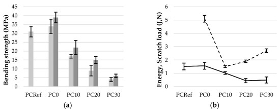 The addition of higher coupling agent contents enhanced the overall bending performance (Figure 5a). Thus, it was supported that good chemical, physical, and mechanical properties could only be reached by a good matrix crosslinking instead of a better compaction rate. Remarkably, PC0 displayed impact energy similar to PCRef and the best scratch critical load among the PCs with RGA (Figure 5b).