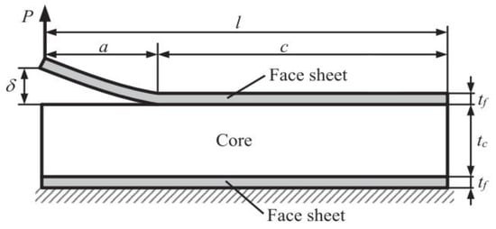 where b is the width of the specimen, is the compliance of the bonded face sheet, is the debond length, and is the force corresponding to the debond growth. Like monolithic laminates, the modified beam theory for sandwich structures uses an analytical compliance solution of the SCB specimen, which is based on beam-on-elastic foundation model and is given by [20]: