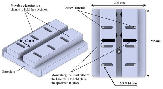 The main objective of the SCB test is to find the static strain energy release rate due to the peeling of the face sheet from the core of the sandwich structure in an opening mode (Mode-I) according to the ASTM standard D5528−13 [23]. The base fixture should be rigid to sustain peak loads and should not impose any rotation during the test. The support fixture was designed in such a way that the adjustable top clamps secure the specimen to the fixed rigid base, which is fastened to the Universal Testing Machine pedestal (UTM). The specimen position can also be adjusted using the wide slots created on the top clamps. When the specimen is loaded, the sandwich specimen is constrained to translate in the longitudinal direction to ensure the applied load is always normal to the specimen. A schematic 3D representation of the fixture is illustrated in Figure 2. A similar loading fixture was used by Ratcliffe and Reeder [22] with loading rods instead of translating base. Both the methods are said to yield similar results, but, due to its simplicity, translating the base fixture is used in this study. The applied force, P, and respective displacement, δ, are recorded using a data logger at several points of interfacial crack growth to calculate the corresponding compliance, .