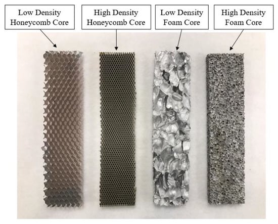 Geometrical dimensions of all the sandwich specimens, according to the specimen sizing presented in Section 2.2, are illustrated in Figure 3. Two different densities of aluminum honeycomb cores and closed cell foams are used as cores (see Figure 4). The material properties of face sheet and core materials are listed in Table 3, respectively.