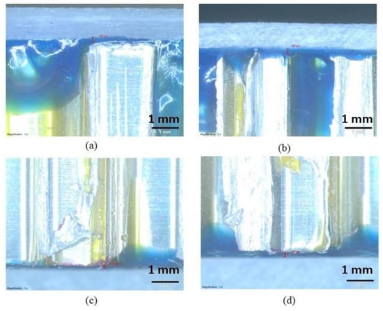 Three specimens in each (SCB1-L, SCB1-H, SCB2-L, and SCB2-H) material configuration were manufactured and tested under static loading. Following, two specimens of SCB1-L, SCB1-H, SCB2-L, and SCB2-H were tested under fatigue loading. Microscopic images of the core and face sheet interface of all the material configurations are presented in Figure 5, Figure 6, Figure 7 and Figure 8.
