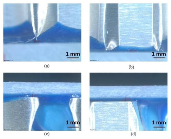 High-density honeycomb (HDHC) face sheet/core interface: (a,b) show the top face sheet/core interface at two different locations; (c,d) show the bottom face sheet/core interface at two different locations.