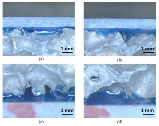 Low-density foam core (LDFC) face sheet/core interface: (a,b) show the top face sheet/core interface at two different locations; (c,d) show the bottom face sheet/core interface at two different locations.