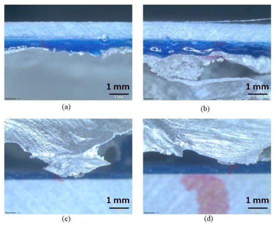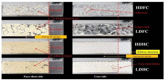 It can be noted from Table 5 that the HDFC samples have the highest average interfacial toughness value compared to the other samples because of the crack kinking into the core of the specimen, which can be seen in Figure 16. The fractured surfaces of the sandwich structures were color inverted for better visualization of intricate details. The fracture surfaces of the face sheets of both honeycomb cores are in yellow, which means they contained adhesive resin material only. On the other hand, the fracture surfaces of the face sheets of both foam cores are yellow and grey, which means they contained both the adhesive resin material and the core. This means that the crack propagated into the foam cores, resulting in the top layer of the foam core being sheared off during the debonding process. Thus, the interfacial toughness of the HDFC samples is larger. It also shows that the tensile strength of the foam cores is lower in the thickness direction compared to the tensile strength of the honeycomb cores. The interfacial toughness of the LDFC is very low compared to the other samples because the top layer of the foam core was supported by a very thin layer of metal with large voids, which makes it easier to peel. This is evident in Figure 17, which shows a detailed analysis of the fractured surface of the sandwich specimens.