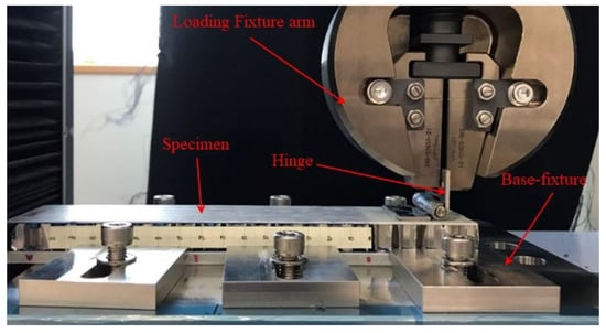 All static single cantilever beam (SCB) tests were carried out using a 10 kN Shimadzu Universal Tensile Machine (UTM). A baseplate support fixture was attached to the lower part of the machine to secure the specimen using clamps. As shown in Figure 9, the bottom part of the SCB sandwich specimen was then positioned on this rigid baseplate, while the top face sheet of the specimen with the initial crack was clamped to the UTM using a door hinge.