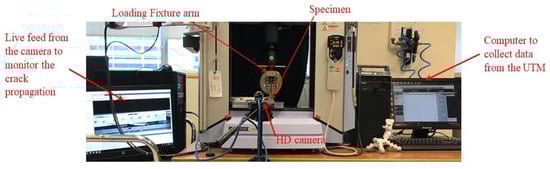 A thin layer of white paint was coated on the crack path of the specimen to visually observe the propagation of the crack. The initial crack front was marked on the edge of the specimens at which a graph sheet was pasted for measuring crack growth. Twelve SCB specimens were then loaded under displacement control at a rate of 1.0 mm per minute in the vertical direction. A digital camera equipped with macroscopic lens was placed to record the crack propagation. Figure 10 shows live crack monitoring instrumentation and UTM connected with a DAQ constantly recorded the values of applied load, P, and the corresponding displacement, δ. Once the pre-crack in the adhesive layer reached a length of 60 mm, test was stopped, and the specimen was removed.