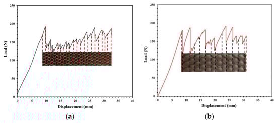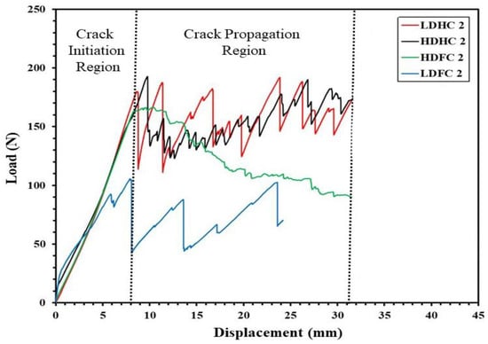 The critical peak load for the HDFC sandwich structures is 166.33 N at 9.83 mm cross-head displacement, and the critical peak load for LDFC sandwich structures is 102.71 N at 8.05 mm cross-head displacement. The percentage reduction in load between the two-foam core configurations is 38.32%. Since the characteristics of load versus displacement plot are directly related to the interface of the cracked path, a side-by-side comparison of both is performed to have a better understanding of the different sandwich configurations. The biggest difference between the load-displacement curves for both honeycomb cores is the number of peaks and troughs. Comparing both load-displacement curves together, the curve for the high-density honeycomb core has more peaks and troughs than the high-density honeycomb core sandwich structures. The difference in the number of peaks was due to the formation of adhesive fillets near the cell walls because of the cells and the free flow characteristics of the adhesive during curing. This can be seen in Figure 12a,b, where the distance between each peak corresponds to the length of the cell size. Each peak corresponds to the resistance provided by the cell wall of the honeycomb structure, and each trough was due to the cell.
