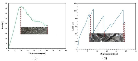 Comparison of core surface geometry to the load vs. displacement plot (a) HDHC; (b) LDHC; (c) HDFC; (d) LDFC.